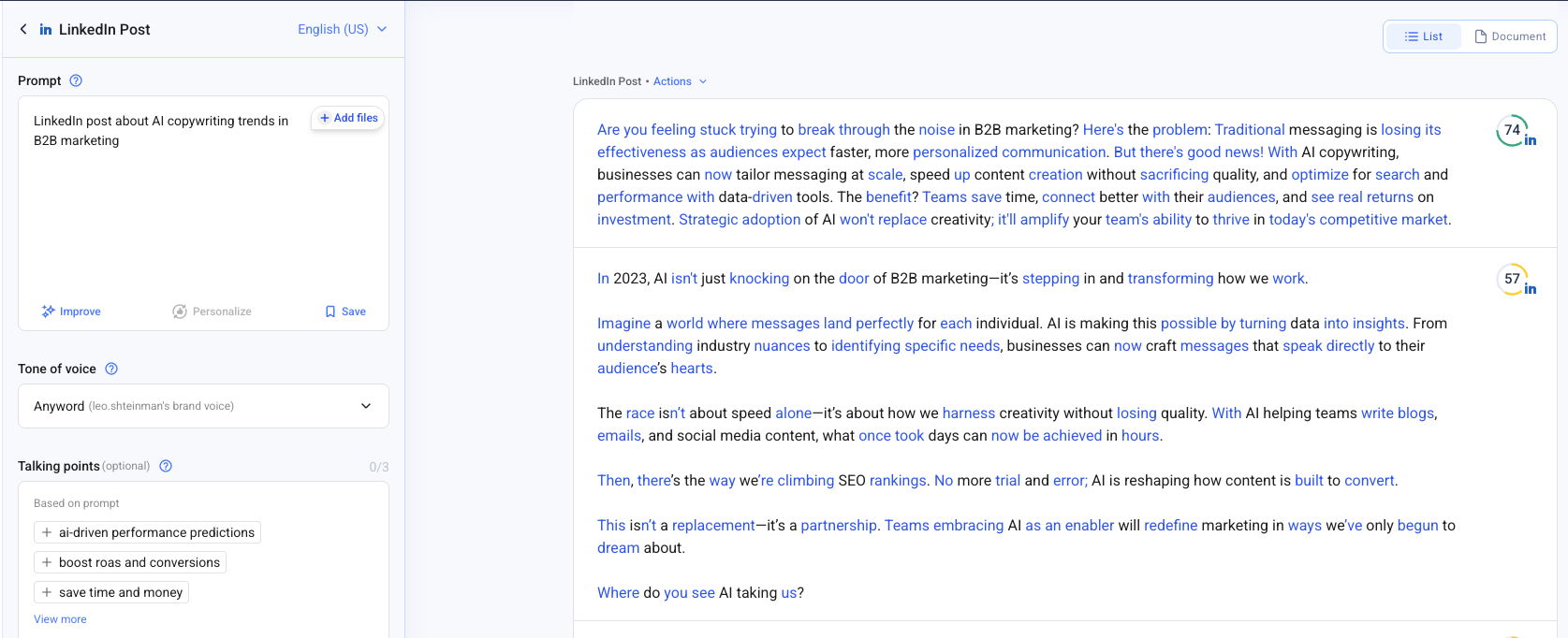 When generating content, Anyword incorporates at least one of your selected talking points while staying true to your phrasing.
