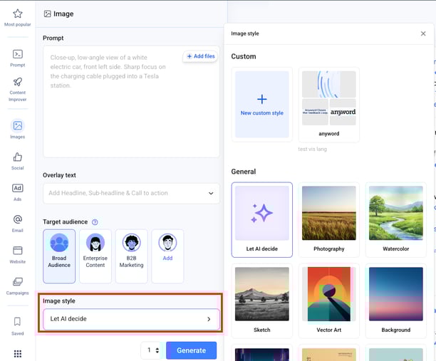 When you generate an image in Anyword, you can choose from predefined styles or upload your own examples to create a Custom Style.