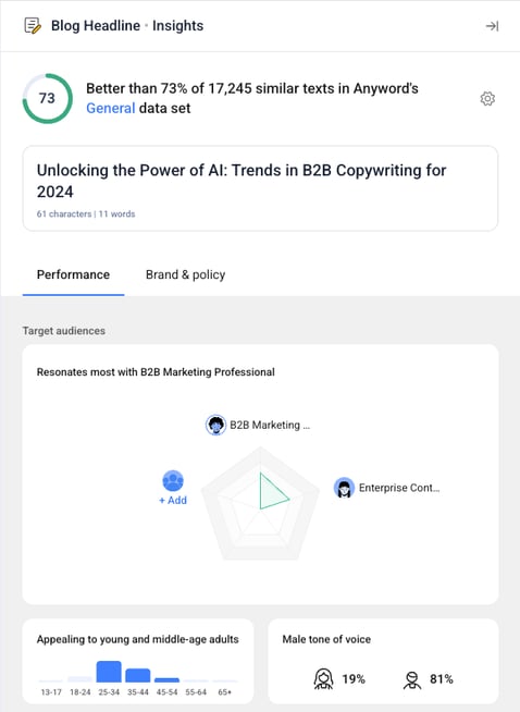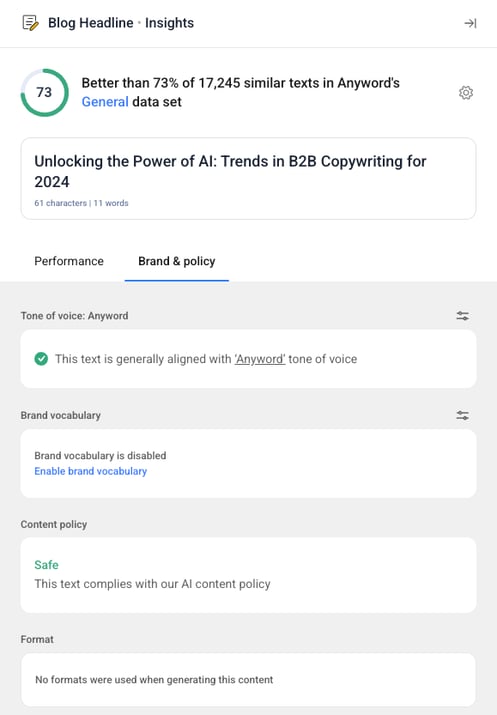 Every variation created in Anyword comes with an Insights Panel — a powerful view that helps you understand how your content performs and aligns with your brand.